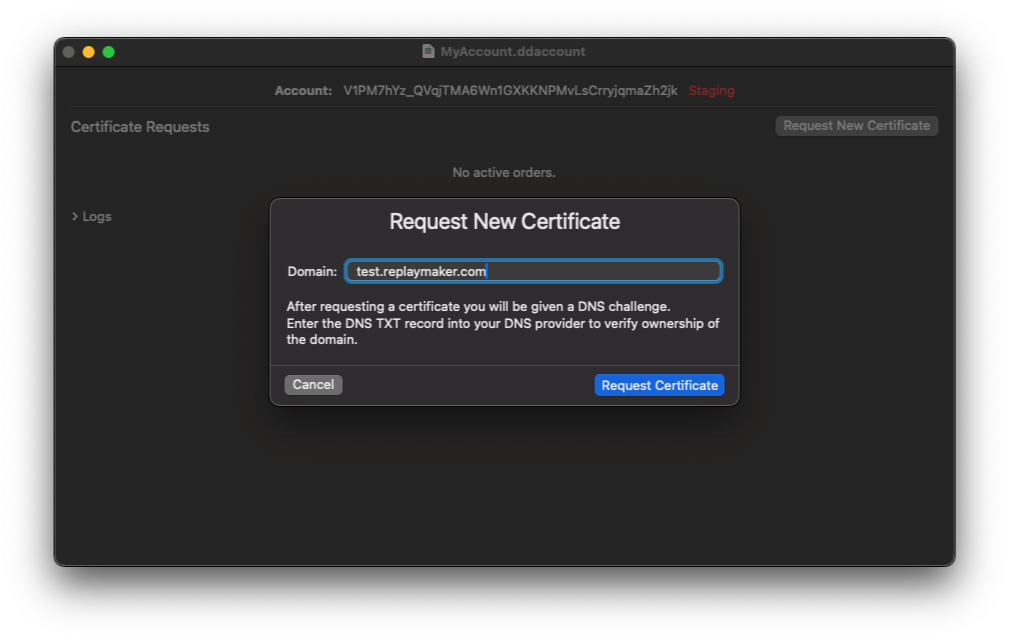 Add the domain you wish to create the certificate for, and press Request Certificate: