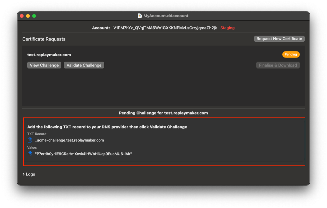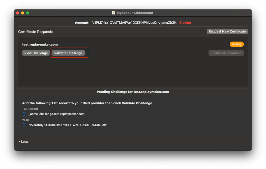 Once your DNS settings have been updated with your challenge, you can click Validate Challenge: