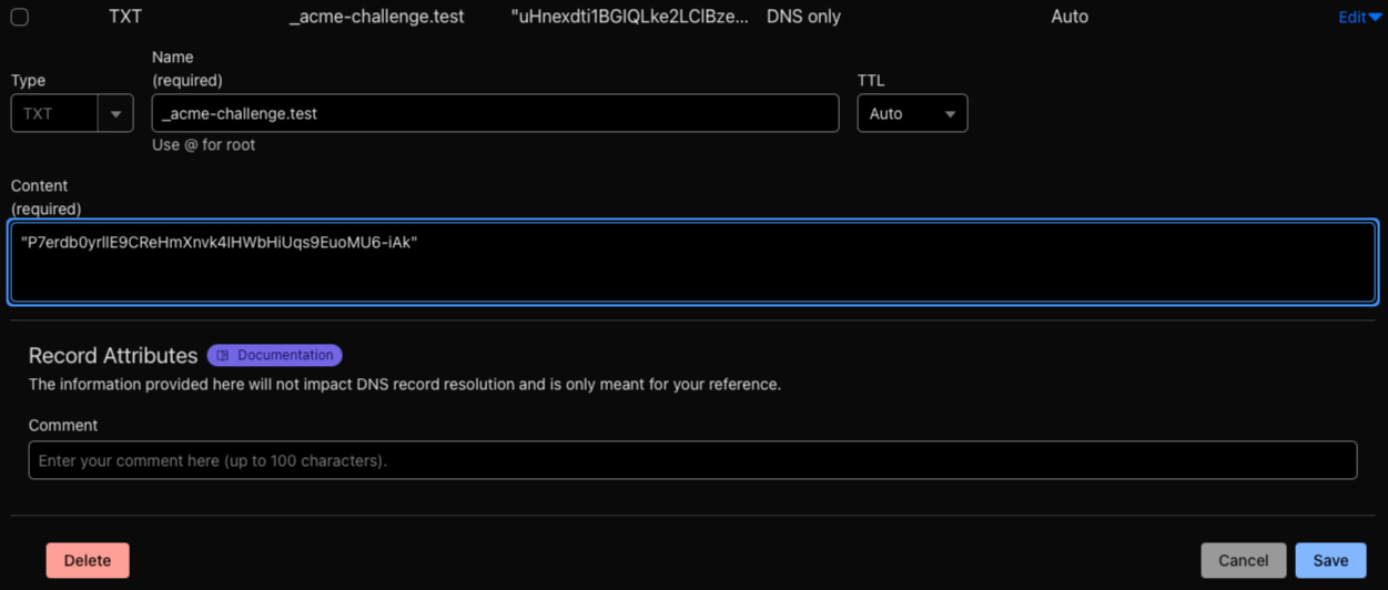After requesting your certificate, you'll be presented with your new order in the order list, as well as the challenge you need to set in your DNS settings: