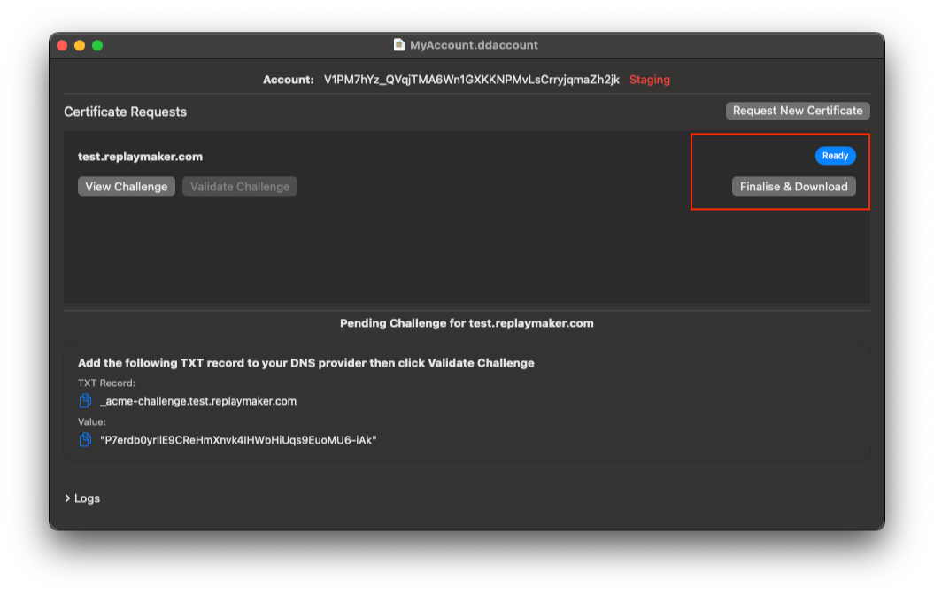 If the challenge is validated successfully, your order is ready to be finalised. Click on Finalise & Download to finalise the order.Note: If your challenge is unsuccessful your order is no longer valid, and you will have to start this process again.